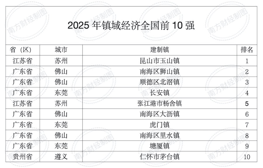 图为2025镇域经济全国前10强名单。南方财经记者制图,数据来源:赛迪四川